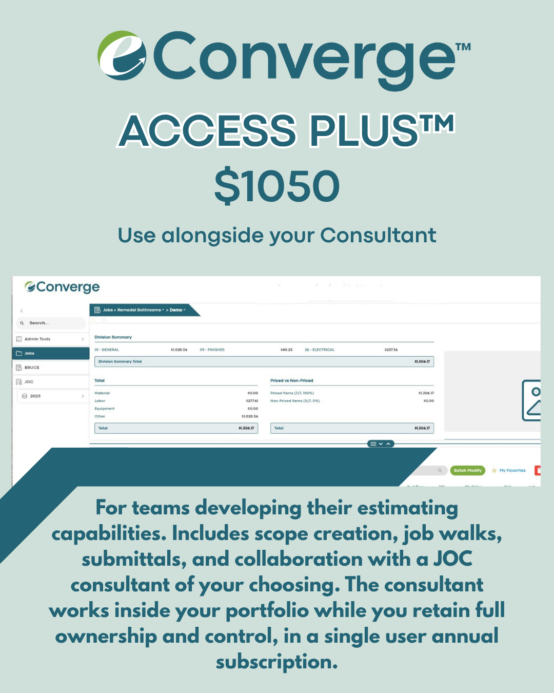 eConverge™ puts you in control of your Job Order Contracting process: no fees, no limits on how you manage your contracts, and no compromises on performance or transparency.